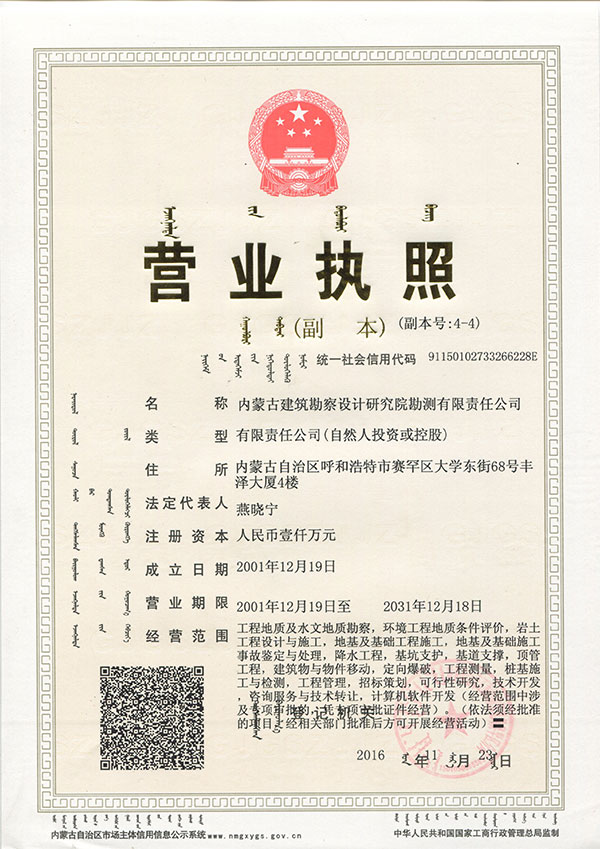 - 內(nèi)蒙古建筑勘察設(shè)計(jì)研究院勘測(cè)有限責(zé)任公司,是全國(guó)首家完成 轉(zhuǎn)企建制的省級(jí)建筑勘察設(shè)計(jì)單位。公司前身為內(nèi)蒙古建筑勘察 設(shè)計(jì)研究院勘測(cè)分院, 成立于1954年 ,經(jīng)過(guò)六十多年的發(fā)展, 現(xiàn)已成為全區(qū)技術(shù)力量雄厚、專(zhuān)業(yè)設(shè)置齊全的集巖土工程勘察 、 設(shè)計(jì)、治理、檢測(cè)、監(jiān)理、咨詢(xún)、水文地質(zhì)勘查、工程測(cè)量、科 研為一體的綜合性企業(yè) ... ... [查看詳情]